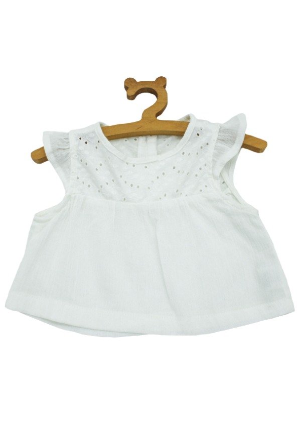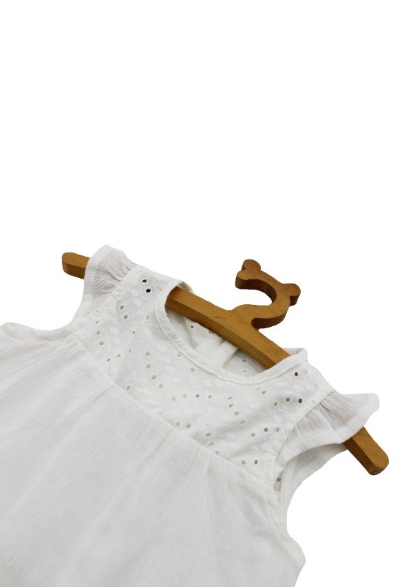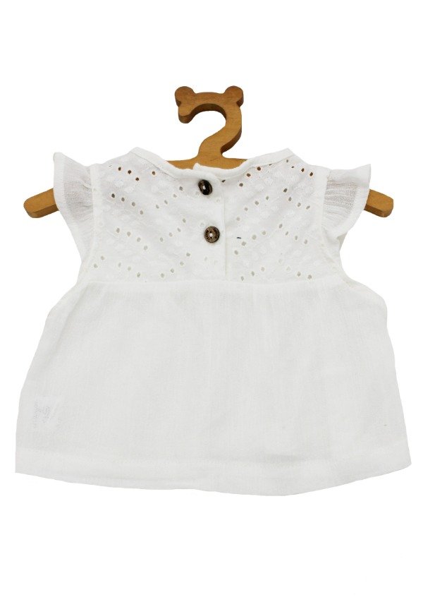 Camisola de algodón blanco con pechera en broderie de algodón. Tiene mangas voladas. Botones en la espalda.