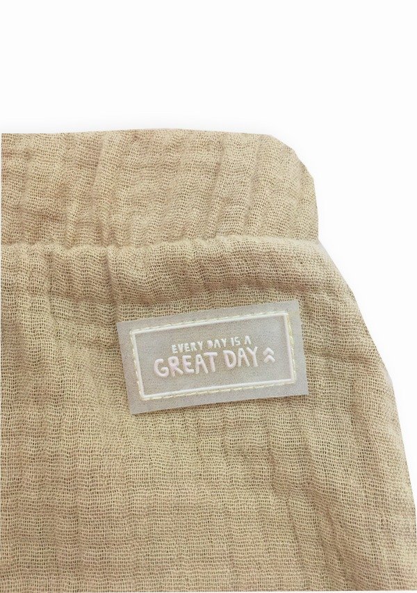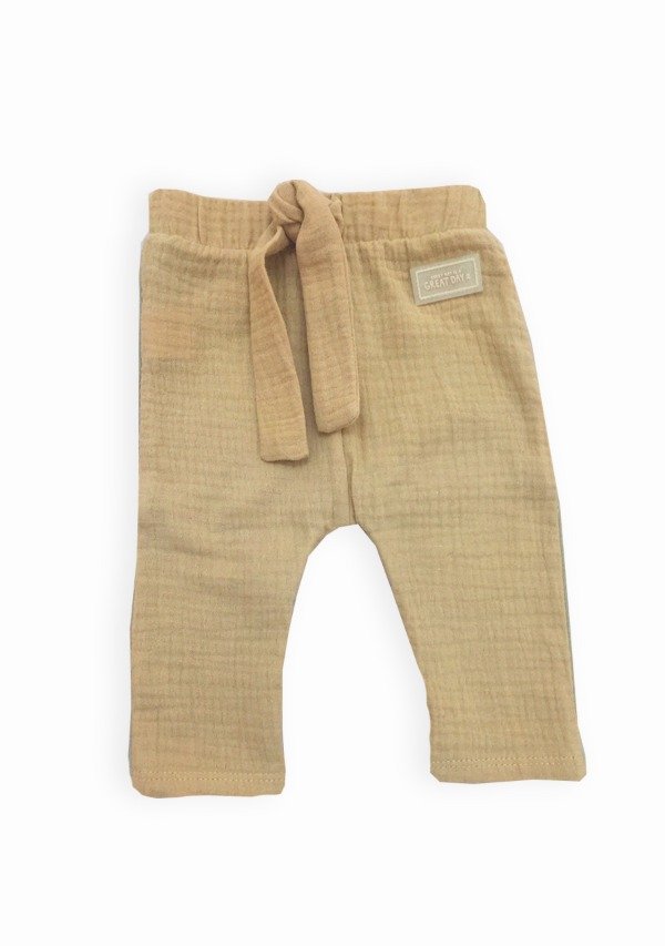Pantalón confeccionado en gasa de algodón al frente y algodón al reverso, color beige. Cintura elastizada con tira de la misma tela.