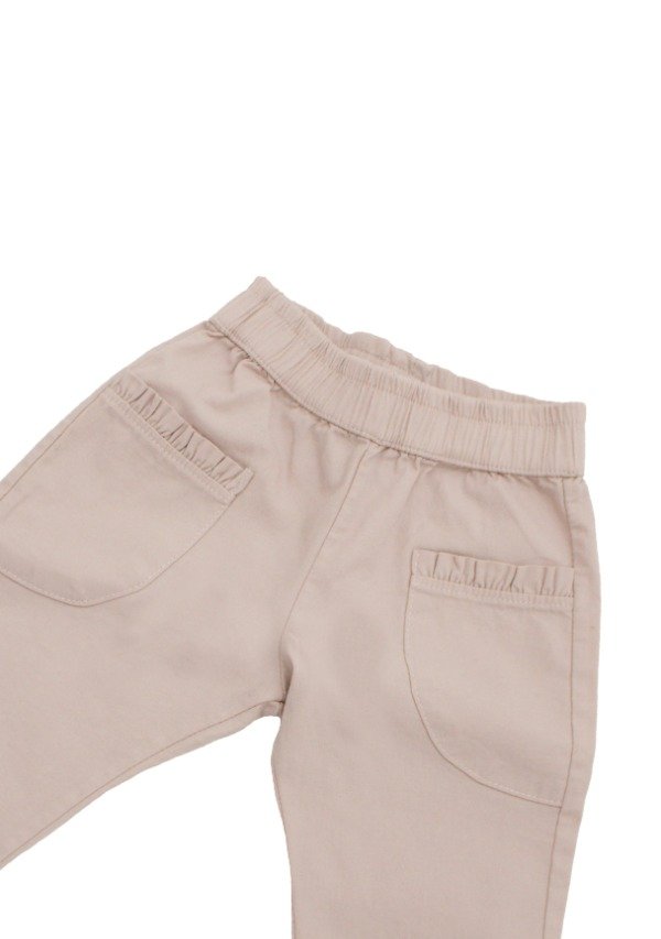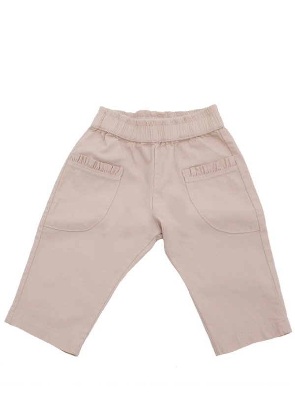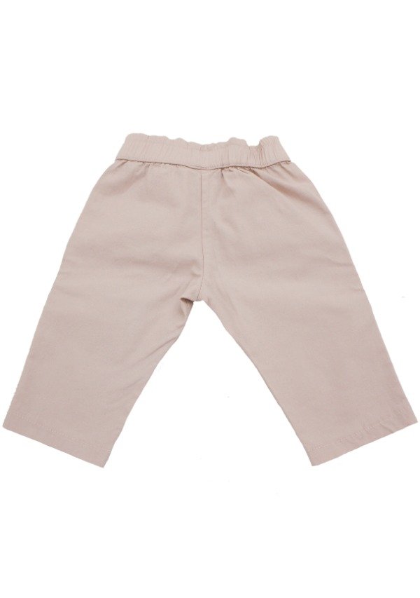 Pantalón de gabardina rosa con cintura elastizada. Tiene bolsillos delanteros con voladitos.