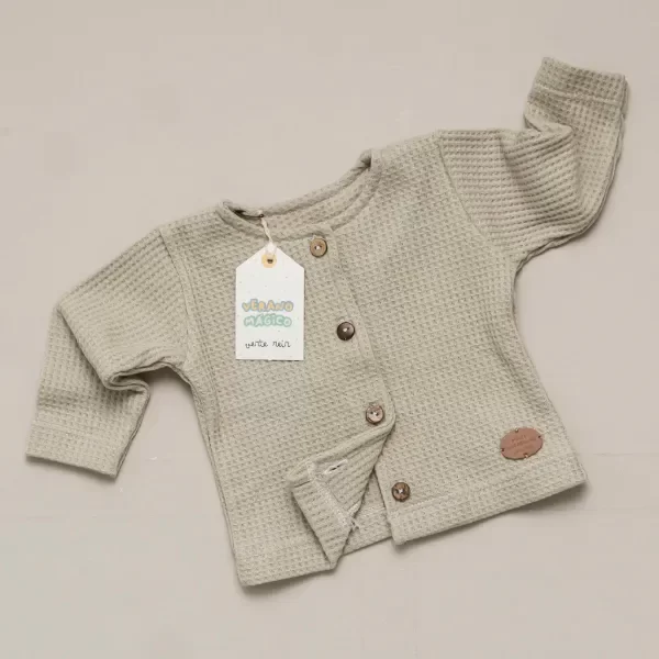 Abrigo liviano y versátil, perfecto para acompañar cualquier ajuarcito o conjunto de algodón. Diseño delicado con botoncitos de coco.