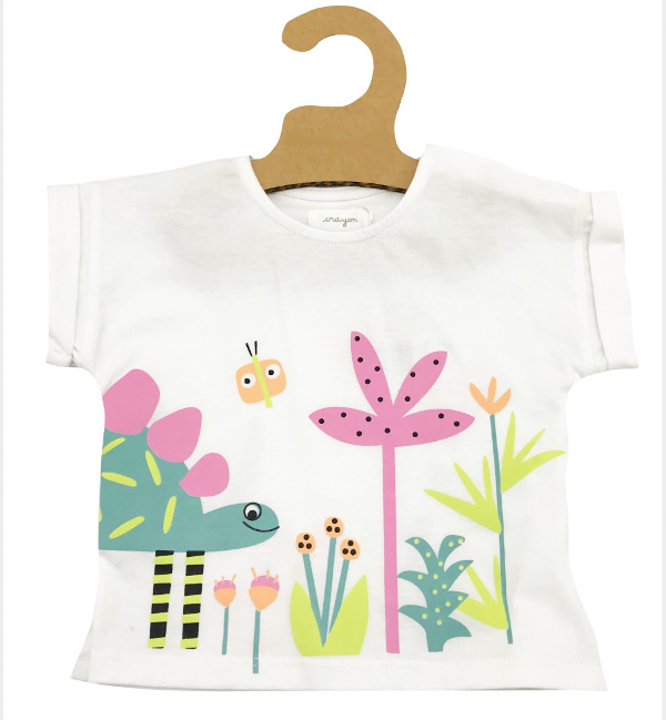 Remera manga corta de algodón blanco (100% algodón). Estampada en el frente y en la espalda. Broches en el hombro.