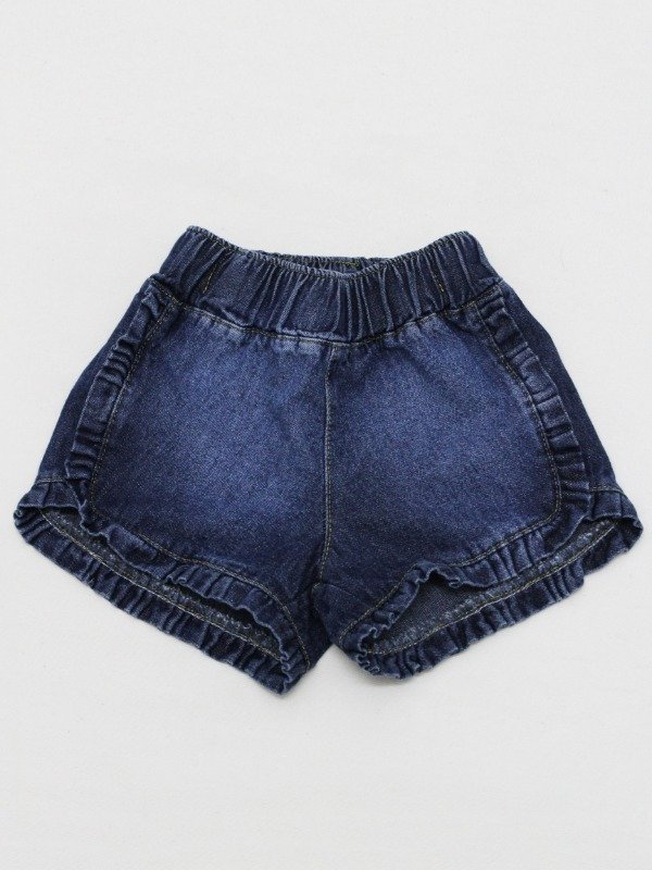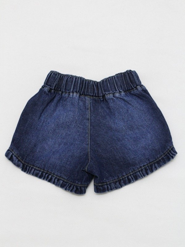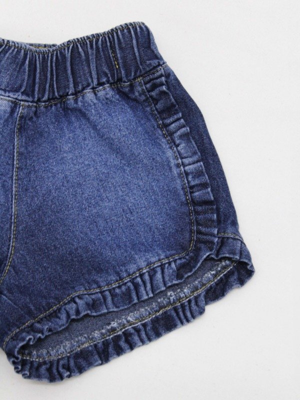 Short de jean azul con cintura elastizada y regulable en su interior. Tiene volados todo alrededor.